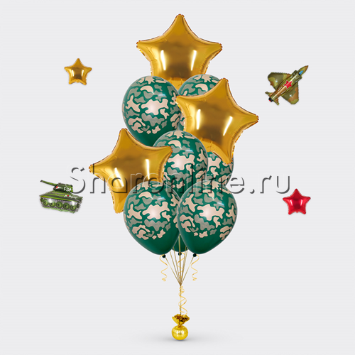 Фольгированные шары камуфляжной расцветки, большие звезды, почти как на погонах - эта огромная охапка “Для мужчин” сможет растопить сердце самого брутального мужчины. Ведь все они в душе дети! Такой оригинальный презент можно вручить по поводу профессионального праздника, на 23 февраля, 9 мая, по возвращении сына из армии, военнослужащему в день его рождения. Поверьте, каждый мужчина будет в восторге!