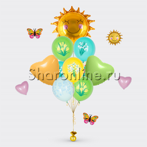Праздничный день станет еще и солнечным, если вы украсите его соответствующим букетом воздушных шаров. Его сложно не заметить: прямо на вас смотрит большое улыбающееся солнце, выглядывающее из ярких цветных шариков!
