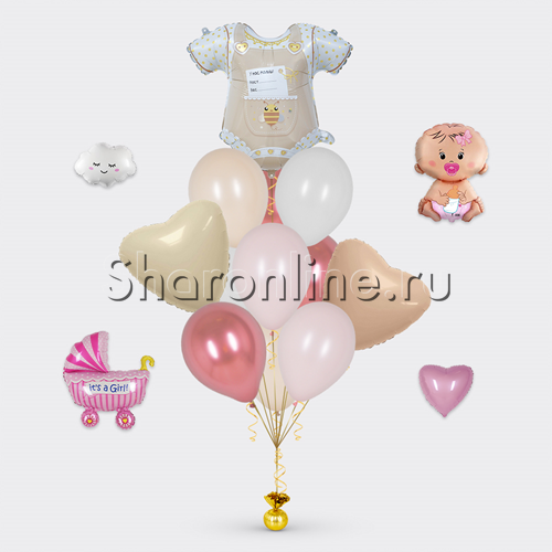 Это счастье. И поэтому, отметить это событие нужно красиво! Наш воздушный букет создан как раз для совсем маленьких принцесс. Нежные тона, приятный розовый и белый цвет, разные по форме и фактуре шарики с тематическими рисунками. Золотой грузик не даст шарикам упорхнуть - букет можно будет поставить в комнате. Что же включает в себя этот замечательный букет?