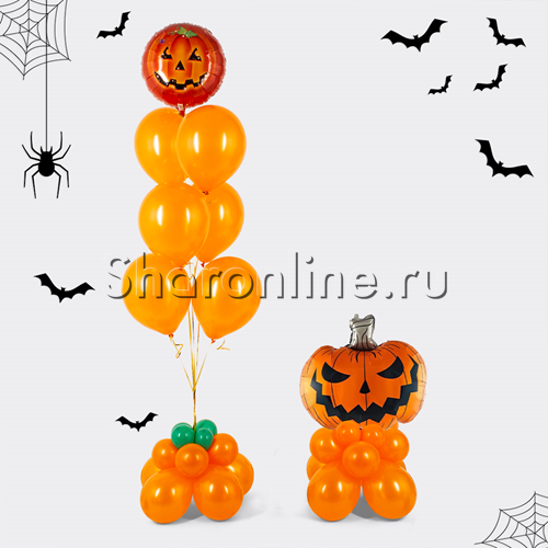 - Фонтан на мини-стойке из 6-ти латексных шаров оранжевый металлик с фольгированным кругом "Тыква Улыбающаяся" 46 см