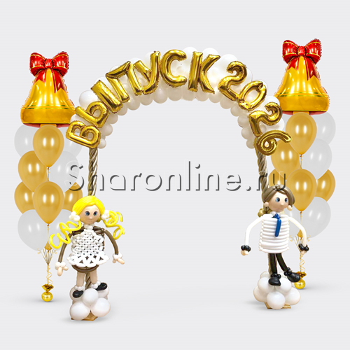 В руках у школьников облако шаров из 15 шаров белый пастель и золотой хром с фольгированной фигурой "Колокольчик с ленточкой" 77 см.