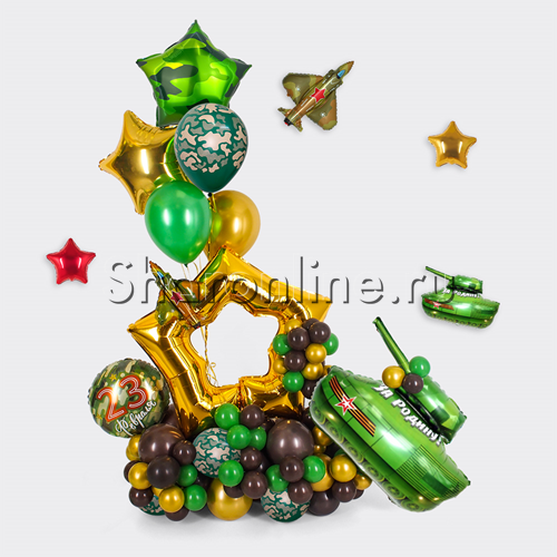 - 1 фонтан из: 1 фольгированной золотой звезды 46 см, 1 фольгированной звезды "Камуфляж 46 см", 1 латексного шара камуфляж, 1 латексного шара зеленый металлик и 1 латексного шара золотой хром 30 см
