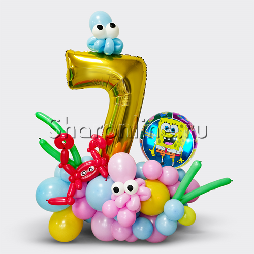 Композиция из шаров "В стиле Губка Боб" с цифрой