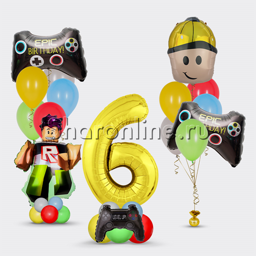 - 1 фольгированная фигура "Мальчик Герой" 58 см / 1 фольгированная фигура "Мальчики герои. Блоки" 86 см на стойке