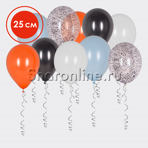 Цветовая гамма: оранжевый, голубой и белый пастель, черный пастель, прозрачный с пенопластовым конфетти.